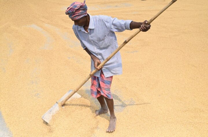 A farmer winnows paddy grains at field on bright sunny day at Agartala on Monday (24th April, 2023).