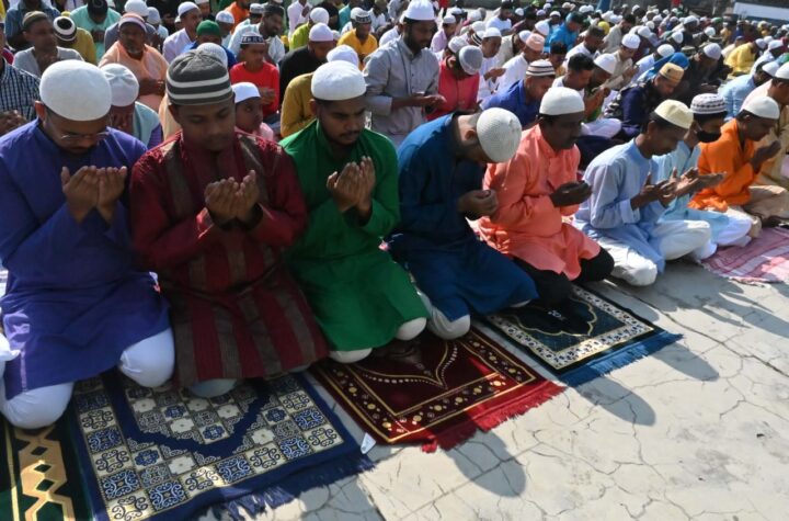 Muslim devotees prayers at the Gedu Mia Mosque on the occasion of Eid-ul–Fitr at Agartala on Saturday (22nd April, 2023).