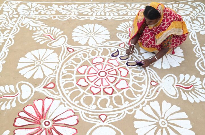 A woman paints a ‘Rangoli’ design in front of her house on the occasion of ‘Makar Sankranti’ at Lankamura village,...
