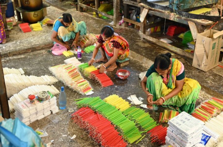 Women workers prepare colourful candles for sale ahead of the Diwali festival in Agartala on Friday (14th October, 2022).
