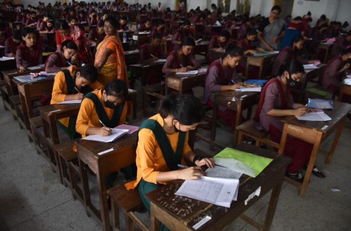 Students appear in the Term-II Tripura Board of Secondary Education (TBSE) for Class 10, at an examination centre in Agartala...