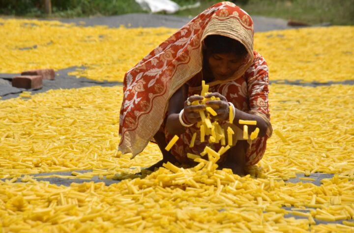 A woman labourer dries a fry-able snack made from seasoned dough at Agartala.