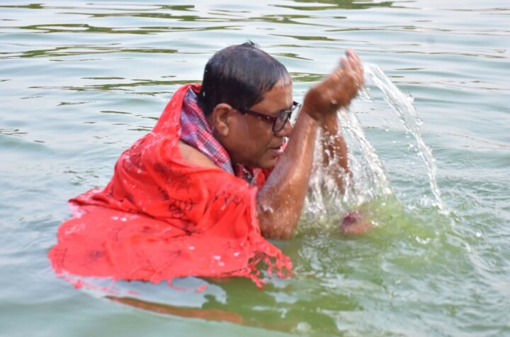 Hindu devotees perform "Tarpan" rituals as they stand in a lake to seek blessings for departed family members in Agartala,...