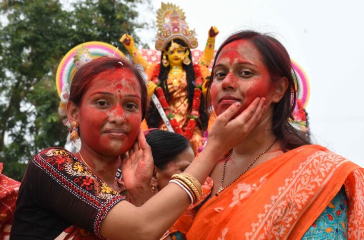 On the last day of Basanti Puja's Dashami, the married women in Sindoor khela in Agartala on Thursday 22nd April...