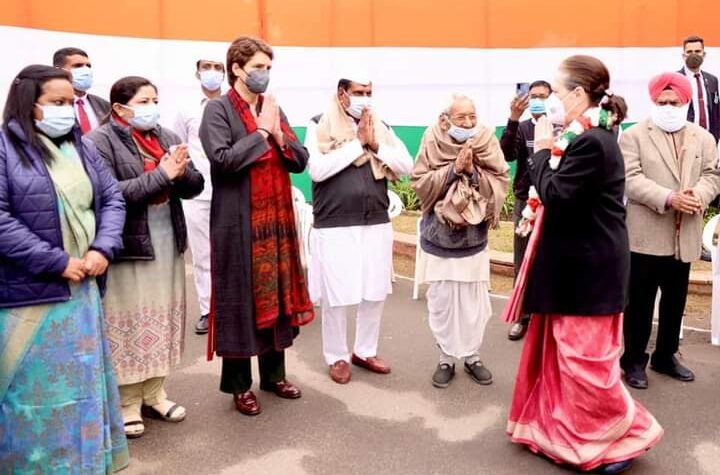Congress President Sonia Gandhi greets fellow Congress Members on the occasion of the 137th Congress Foundation Day celebrations at the...