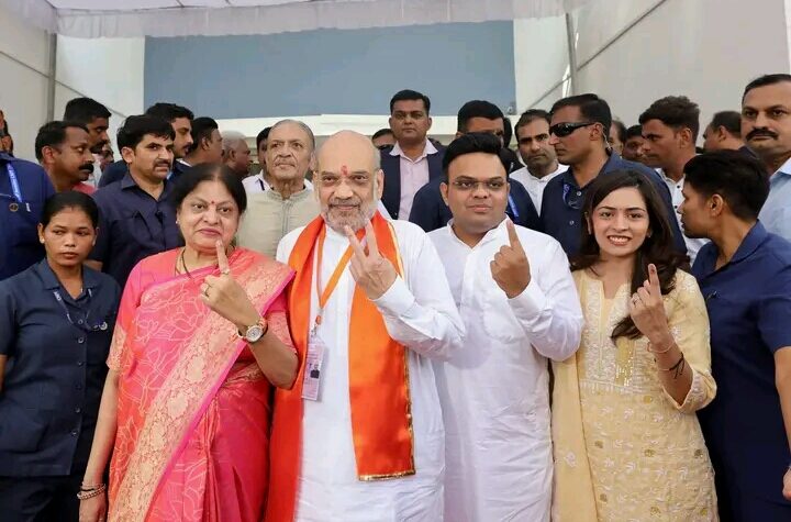 Gujarat, 7th of May, 2024 : Union Home Minister Amit Shah cast his vote at a polling booth in Ahmedabad...