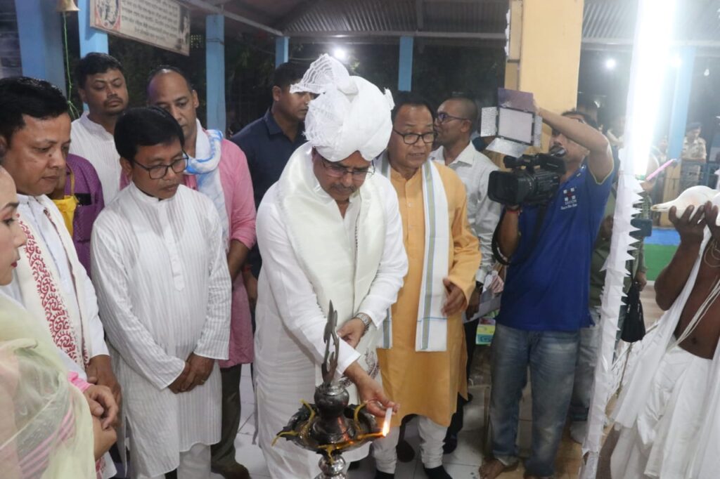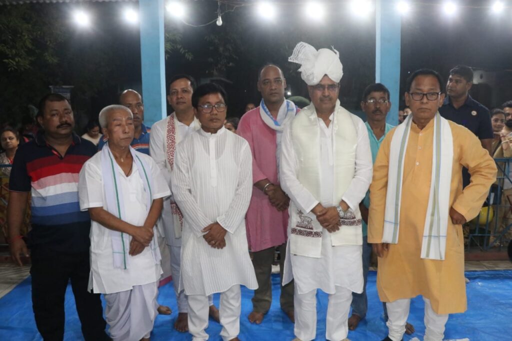 An artist wearing a traditional Manipuri dress dance a candle as she performs at the Maha Raas. Hon’ble Chief Minister Dr. Manik Saha attended the Annual Maha Raas Purnima at Radha Madhav Temple, Radhanagar.