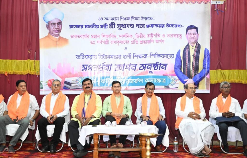 Fatikroy, Tripura, 7th of September, 2025 : With the initiative of SC Welfare, ARD, Fisheries Minister Sudhangshu Das 64th Teachers’ Day celebration has been conducted under Fatikroy Assembly Constituency at Nazrul Kalakshetra, Fatikroy, Tripura on Sunday (7th September, 2025). In the presence of many dignitaries Hon’ble SC Welfare, ARD, Fisheries Minister Sudhangshu Das inaugurated the programme by lighting the lamp.