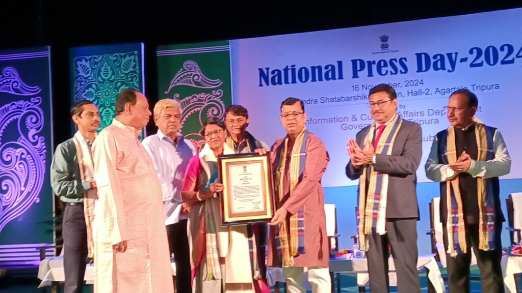 Agartala, Tripura, 16th of November, 2024 : With the initiative of Information and Cultural Affairs Department of the Government of Tripura celebrated National Press Day in collaboration with the Agartala Press Club at Rabindra Satabarshiki Bhawan, Agartala on Saturday (16th November, 2024). In the presence of many dignitaries Hon’ble Youth Affairs & Sports, Social Welfare & Social Education Minister Tinku Roy inaugurated the ceremony by lighting the lamp.