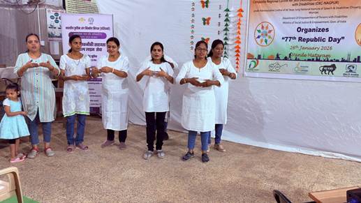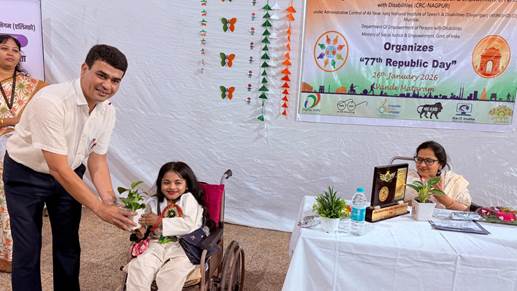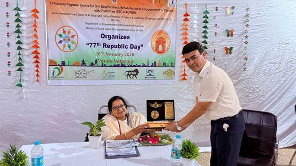 The 77th Republic Day of India was celebrated with great enthusiasm and patriotic fervour at the Composite Regional Centre for Skill Development, Rehabilitation & Empowerment of Persons with Disabilities (CRC–Nagpur), under the Ministry of Social Justice & Empowerment, Government of India. The programme commenced with a ceremonial salute commanded by Mr. Venkatesh Belkhode, followed by the hoisting of the National Flag by Shri Prafull Shinde, Director, CRC Nagpur. The National Anthem was sung collectively with Pushpaanjali. The celebration witnessed active participation from CRC Nagpur staff, PM Divyasha Kendra staff, CCCGP students, parents, caregivers, children, and members of the general public, reflecting unity and patriotic spirit.