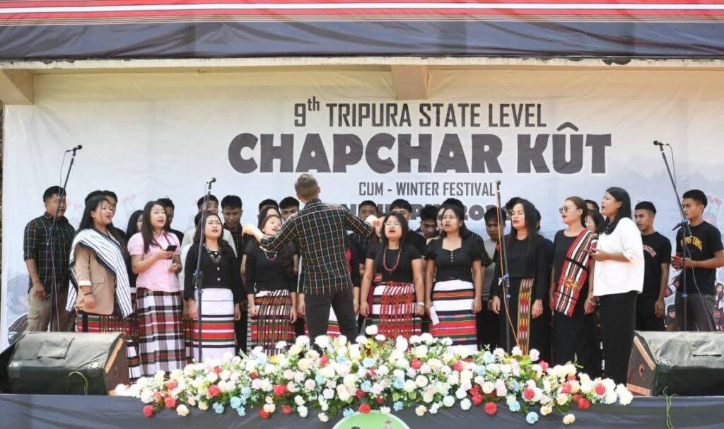 Dharmanagar, Tripura, 17th of March, 2026 : Despite heavy rainfall, the traditional festival “Chapchar Kut” was celebrated with great enthusiasm at Hmumpui Village in the Jampui Hills of North Tripura district. The state-level event was graced by the District Magistrate of North Tripura, Chandni Chandran, IAS. Other dignitaries present included Debabrata Roy and Information & Cultural Affairs official Ripon Chakma.The presence of distinguished guests added prestige to the occasion. Even amid intense rain, the enthusiasm of the local people remained undiminished. The event came alive with vibrant performances of traditional dance, music, and cultural displays.