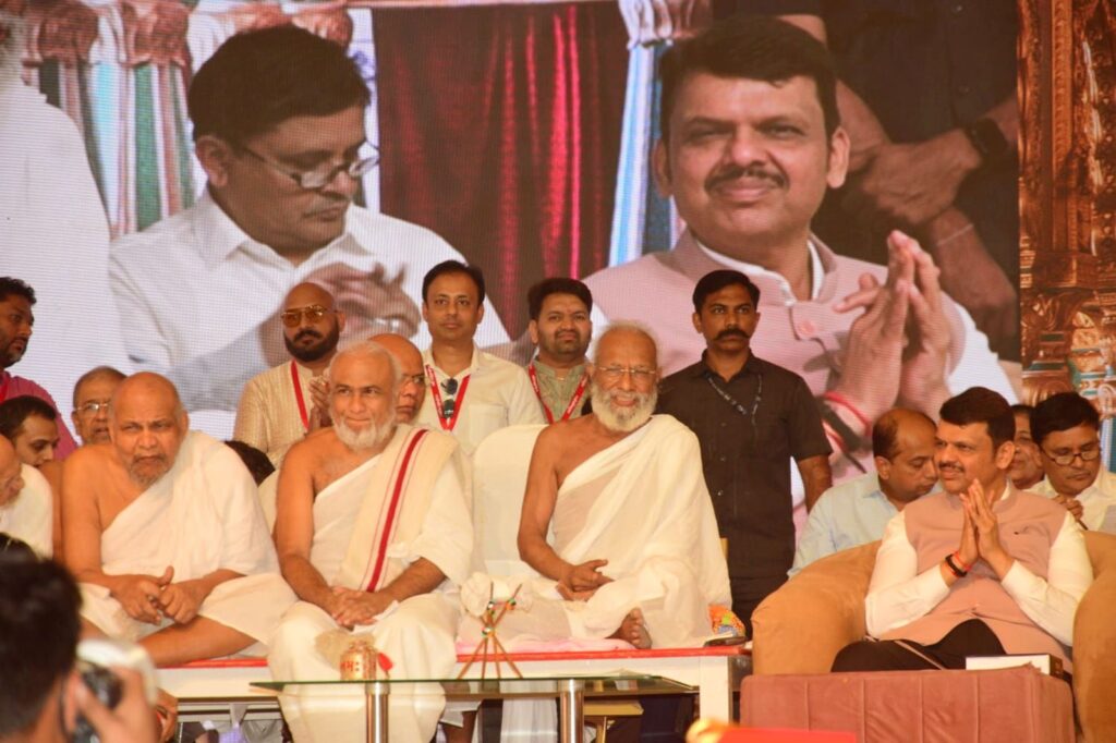 Chief Minister Devendra Fadnavis received blessings from the assembled saints and was accorded a warm and respectful felicitation by Jain Acharyas. The event was also attended by Maharashtra Cabinet Minister Shri Mangal Prabhat Lodha, local MLA Shri Sanjay Upadhyay, Smt. Manisha Tai Chaudhary, Shri Gopal Shetty, and several other distinguished dignitaries.
