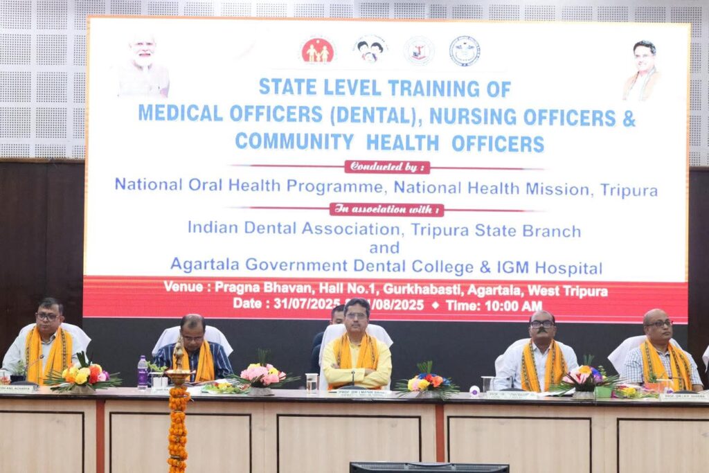 Agartala, Tripura, 1st of August 2025 : Efforts are underway not only in Agartala but also in the district and sub-divisional hospitals across the state to establish modem medical infrastructure. Kidney transplants are already being performed in the state, and steps are being taken to create the necessary infrastructure for liver and heart transplants as well. A Super Specialty Block has been built at AGMC at a cost of 250 crore. Chief Minister Dr. Manik Saha said this while inaugurating a state-level training camp for Dental Medical Officers, Nursing Officers, and Community Health Officers at Pragna Bhavan on Thursday (31st July, 2025). The two-day training program is being organized by the Tripura Dental Association, Agartala Dental College, and IGM Hospital under the National Oral Health and National Health Mission initiatives. On the occasion, the Chief Minister also flagged off two Blood Collection Transportation Vans for Kailashahar and Bishalgarh hospitals.