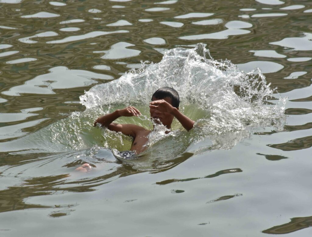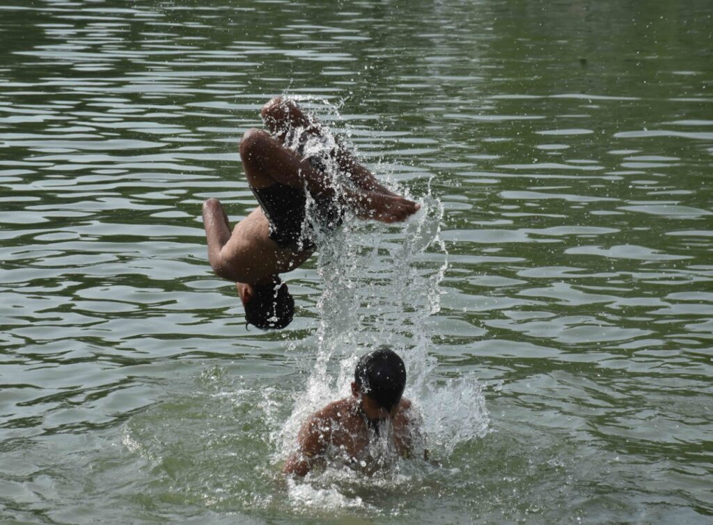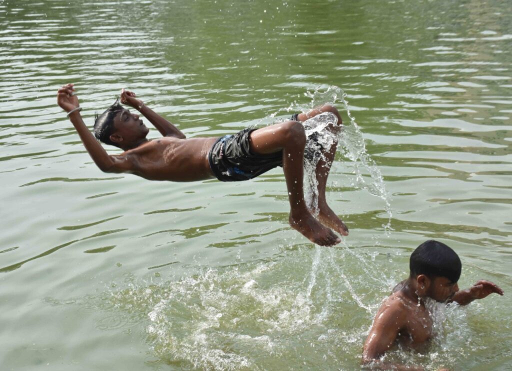 Children Are Taking Fun Bath In A Pond On A Hot Day.