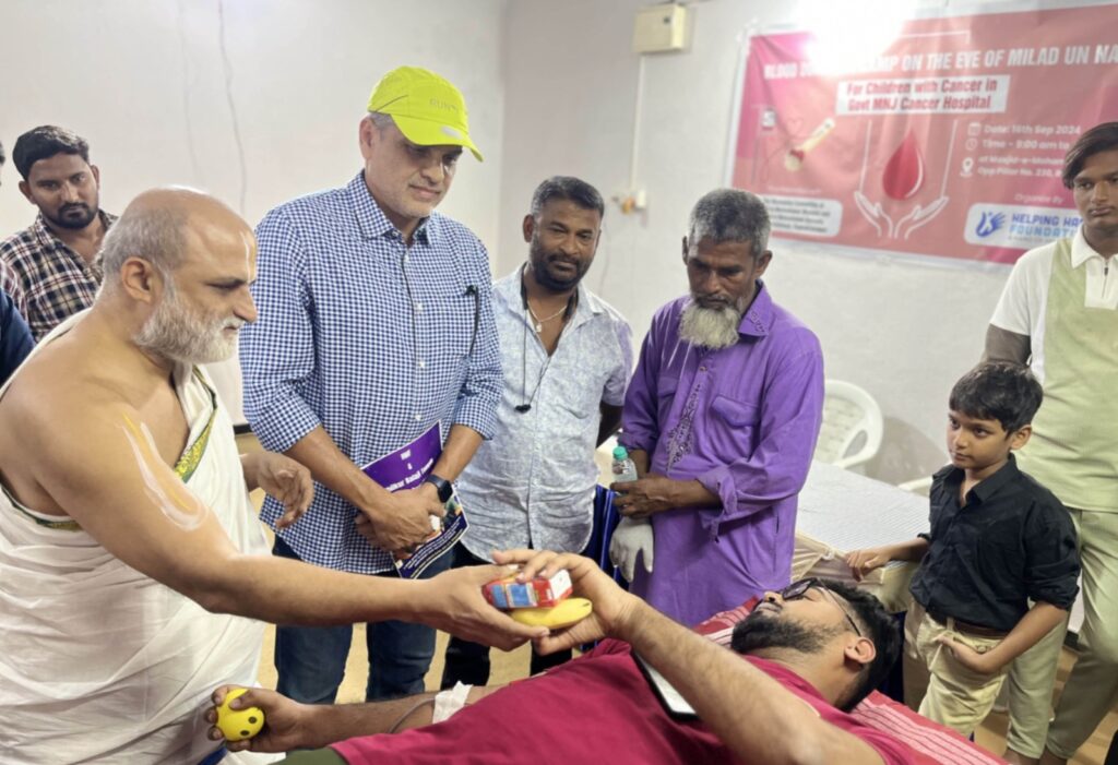 HHF has been working in MNJ Cancer hospital for the last 10 years and there is a high load on the hospital & its blood bank, which compels people to fetch blood from outside. We are aiming to donate at least 200 Units of blood for Child Cancer patients today & this will be given free to all patients by the hospital said Mujtaba Hasan Askari of Helping Hand Foundation.