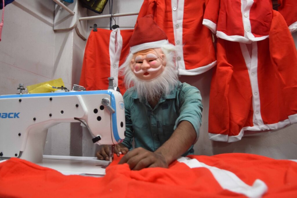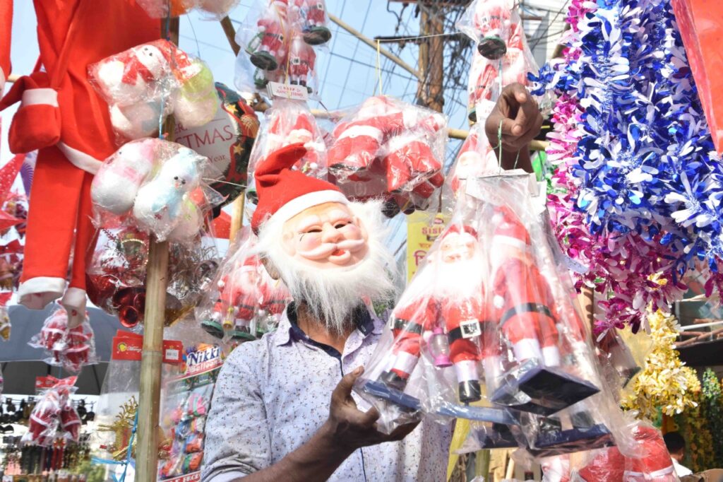 Christmas decorative items in vendor stalls ahead of Christmas festival in Agartala.
