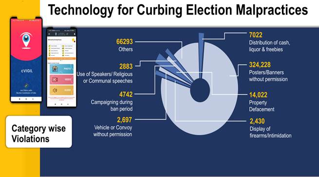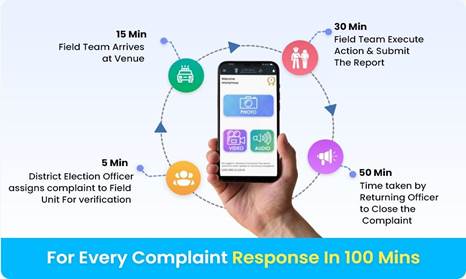 A trinity of factors working simultaneously makes cVIGIL a success. Users capture audios, photos or videos in real-time, and a “100-minute” countdown for time-bound response to complaints is ensured. The app automatically enables a geo-tagging feature as soon as the user switches on their camera in the cVIGIL to report a violation. This means that flying squads can know the precise location of a reported violation, and the image captured by citizens could be used as evidence in the court of law. Citizens can also report complaints anonymously. To prevent misuse, the cVIGIL app incorporates several safeguards, including geographical restrictions, time constraints on reporting, and mechanisms for filtering out duplicate or frivolous complaints. The app is one amongst the armoury of Apps built by the Commission to leverage technology and facilitate voters and political parties.