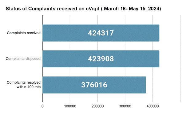 New Delhi, 18th of May, 2024 : In the Lok Sabha polls 2024, the cVIGIL app of Election Commission of India has emerged as a highly effective tool in the hands of people to flag election code violations. Since the announcement of the General Elections 2024, over 4.24 lakh complaints have been received through this App as on May 15, 2024. Out of these 4,23,908 complaints have been disposed of and the remaining 409 cases are under process. Nearly, 89% complaints were resolved within a 100 minutes timeline, a promise by ECI, firmly held.