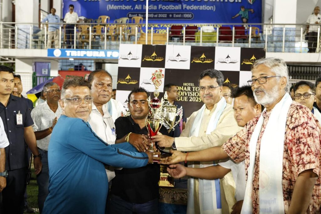 Agartala, Tripura, 7th of July, 2025 : Closing And Prize Giving Ceremony of Hotel Sonar Tori B- Division League Football Tournament was held at Umakanta Mini Stadium in Agartala, Tripura on Monday (7th July, 2025). In this football league started on June 8 in the collaboration of the Tripura Football Association.