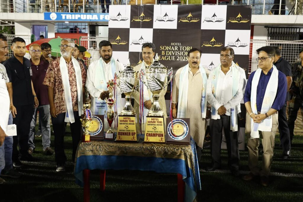 Agartala, Tripura, 7th of July, 2025 : Closing And Prize Giving Ceremony of Hotel Sonar Tori B- Division League Football Tournament was held at Umakanta Mini Stadium in Agartala, Tripura on Monday (7th July, 2025). In this football league started on June 8 in the collaboration of the Tripura Football Association.