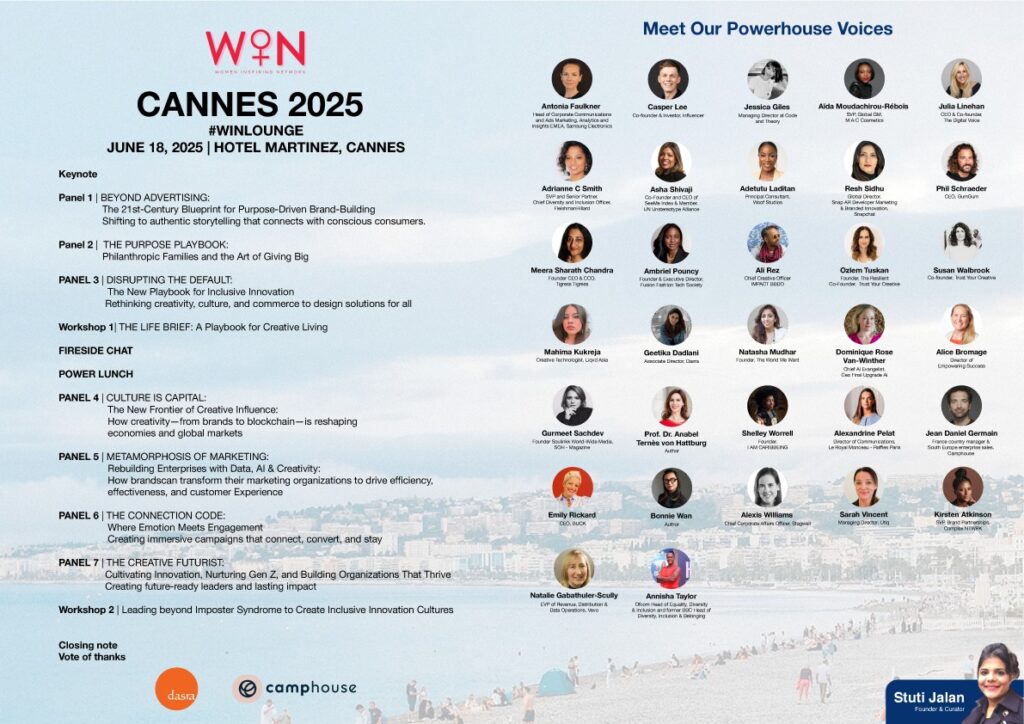 New Delhi, Delhi, 2nd of June, 2025 : Amid the elegance of the French Riviera, Women Inspiring Network (WIN) prepares to host power-packed, day-long discussions on creativity, marketing, innovation, and leadership at the #WIN Lounge on June 18 at the iconic Hotel Martinez, during Cannes Lions 2025—the ultimate convergence of the advertising, communications, and creative worlds. This year, ‘WIN Voices’ podcast debuts at Cannes, spotlighting raw, real stories from global change-makers.