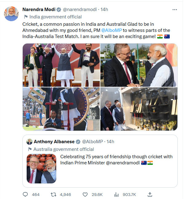 “Cricket, a common passion in India and Australia! Glad to be in Ahmedabad with my good friend, PM Anthony Albanese to witness parts of the India-Australia Test Match. I am sure it will be an exciting game!”, Hon’ble Prime Minister Narendra Modi tweeted.