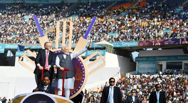 Hon’ble Prime Minister of India Narendra Modi and Hon’ble Prime Minister of Australia Anthony Albanese watch the fourth cricket Test match between Australia and India. The two Prime Minister watch the first day of the Test beginning at Narendra Modi Stadium Ahmedabad, Gujarat on Thursday (9th March, 2023).