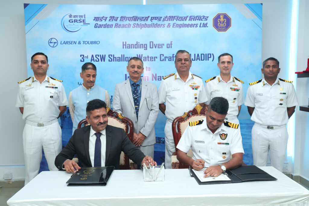 New Delhi, Delhi, 22nd of December 2025 : Anjadip’, the third of eight ASW SWC (Anti-Submarine Warfare Shallow Water Craft), indigenously designed and built by Garden Reach Shipbuilders and Engineers (GRSE), Kolkata, was delivered to the Indian Navy on 22 Dec 2025 at Chennai.