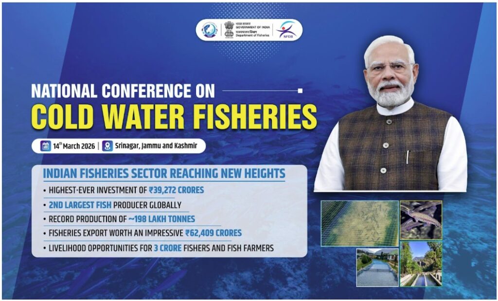 New Delhi, Delhi, 14th of March, 2026 : The Department of Fisheries, Ministry of Fisheries,Animal Husbandry And Dairying, Government of India, is organizing the National Conference on Cold Water Fisheries at the Sher‑e‑Kashmir International Conference Centre (SKICC), Srinagar, Jammu & Kashmir on 14th March 2026. The event will be held under the guidance of Hon’ble Union Minister Shri Rajiv Ranjan Singh, Ministry of Fisheries, Animal Husbandry & Dairying (MoFAHD) and Panchayati Raj, in the august presence of Shri Manoj Sinha, Hon’ble Lieutenant Governor of Jammu & Kashmir; Shri Omar Abdullah, Hon’ble Chief Minister, Jammu and Kashmir; Prof. S.P. Singh Baghel, Hon’ble MoS, MoFAHD, GoI; Shri George Kurian, Hon’ble MoS, MoFAHD, GoI; and Shri Javid Ahmad Dar, Hon’ble Minister, Agriculture Production Department, Jammu & Kashmir. This will be a first‑of‑its‑kind national dialogue on sustainably harnessing the potential of India’s Cold-Water Fisheries for growth and prosperity.