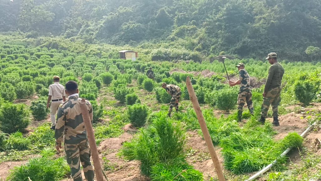 Agartala, 29th of July, 2024 : On 29.07.2024 on getting specific information about Plantation of Ganja in the depth area of Border Out Post (BOP) Salpokar, a joint operation was launched by BSF with PS Jatrapur and forest department in village Neuramura South Taiban. Approximately 50,000 ganja plants cultivated on half hectare( approx) of land were destroyed by cutting and uprooting . Suitable legal action is being taken by concerned department against the land owner.