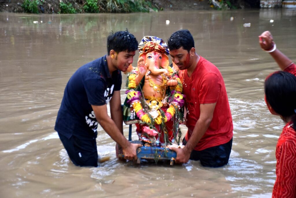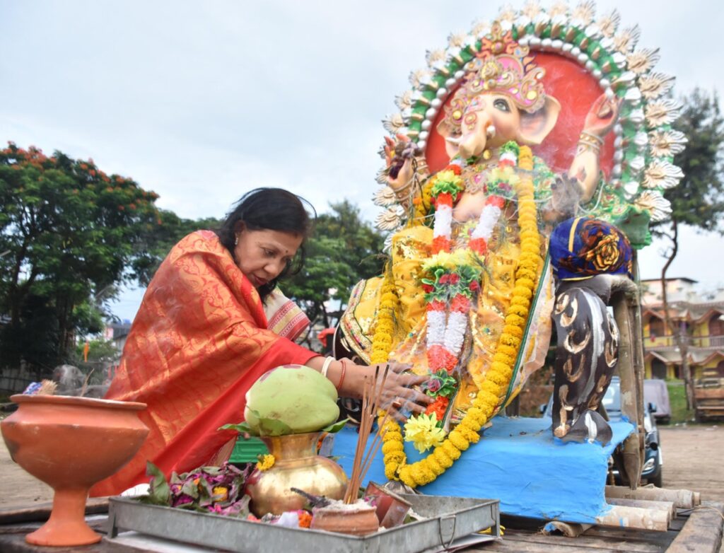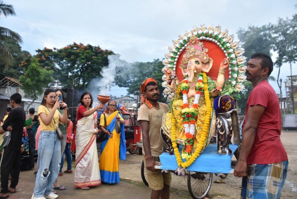 Devotees bid adieu to Lord Ganesha and take him for immersion during Ganesh Chaturthi festival in Agartala on Friday (2nd September, 2022).