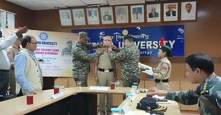 Agartala, 26th of June, 2024 : DG NCC conferred Honorary Rank to Prof. Ganga Prasad Prasain, the Hon’ble Vice Chancellor of Tripura University on 26 June 2024 in Tripura University. National Cadet Corps (NCC), Ministry of Defence, Government of India has conferred the honorary Colonel Rank to Prof. Ganga Prasad Prasain, Vice-Chancellor, Tripura University for his numerous contribution to the NCC in the state of Tripura. The honour has been conferred by Brig. Kapil Sood, Group Commander, NCC HQ. Silchar on 26 June, 2024 in the University premises in presence of NCC officers, N CC cadets, faculties, officers and non teaching staff of the University. The honour recognizes the substantial contributions of the academics to the educational sector and seeks to integrate them more closely into the broader national strategic culture.