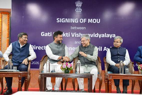 New Delhi, Delhi, 30th of March 2026 : Directorate General of Civil Aviation (DGCA) and Gati Shakti Vishwavidyalaya (GSV) have signed an MoU with an objective of sharing/enhancing of knowledge, skills relevant to the scientific, technological, and management aspects in the broad areas of Aviation, Aviation Engineering and Aviation Management. It was signed by DGCA Shri Faiz Ahmed Kidwai and Vice Chancellor of GSV Prof Manoj Choudhury in the presence of Minister of Civil Aviation Shi Kinjarapu Rammohan Naidu and Minster of Railways, Information & Broadcasting, and Electronics and Information Technology Shri Ashwini Vaishnaw. Secretary, Civil Aviation Shri Samir Kumar Sinha, Chairman Railway Board Shri Satish Kumar and other senior officials from DGCA, Railways and GSV were also present during the occasion.