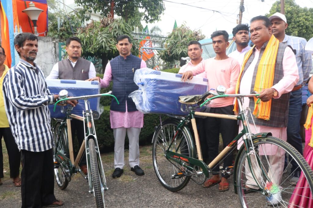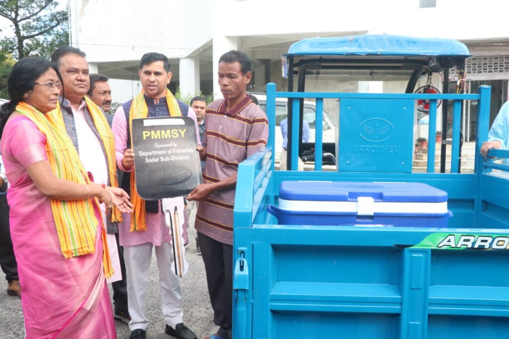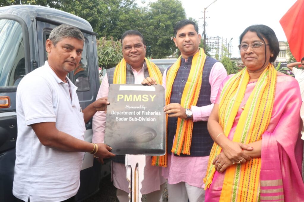 268 fish farmers are being provided assistance in this program. Among them, 200 families have been provided financial assistance of Rs. 6,000 each under the Mukhyamantri Matsya Vikas Yojana, 4 people have been given a three-wheeler with an ice box, 4 people have been given a bicycle with an ice box, 1 person has been given a live fish vending center under the Pradhan Mantri Matsya Sampada Yojana. 46 people have been given financial assistance under the Flood Relief Fund, and 7 people have been issued work orders for digging new ponds. The Fisheries Minister and presents guests handed over this assistance to 10 beneficiaries from each subdivision of the district.