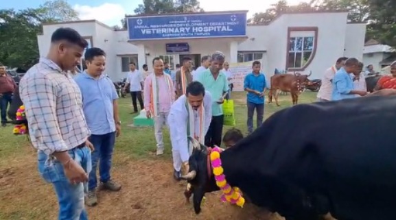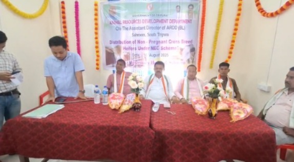 Sabroom, Tripura, 31st of August, 2025 : With the initiative of Animal Resources Development Department Government of Tripura Distribution of Non-Pregnant Cross Breed Heifers Under NEC Scheme at Veterinary Hospital, Sabroom, Tripura on Saturday (30th August, 2025). According to report, in this programme 17 Non-Pregnant Cross Breed Heifers were handed over to the beneficiaries of East Jalefa Gram Panchayat by South District Sabhadipati Dipak Datta. Non-Pregnant Cross Breed Heifers were collected from Patna. On March 28, 8 Non-Pregnant Cross Breed Heifers were distributed in the first phase. Today, the Non-Pregnant Cross Breed Heifers were distributed to 17 beneficiaries through lottery in the second phase. Officials expressed hope that the distribution of cows will lead to economic development of local farmers, increase milk production and expand livelihoods based on animal husbandry.