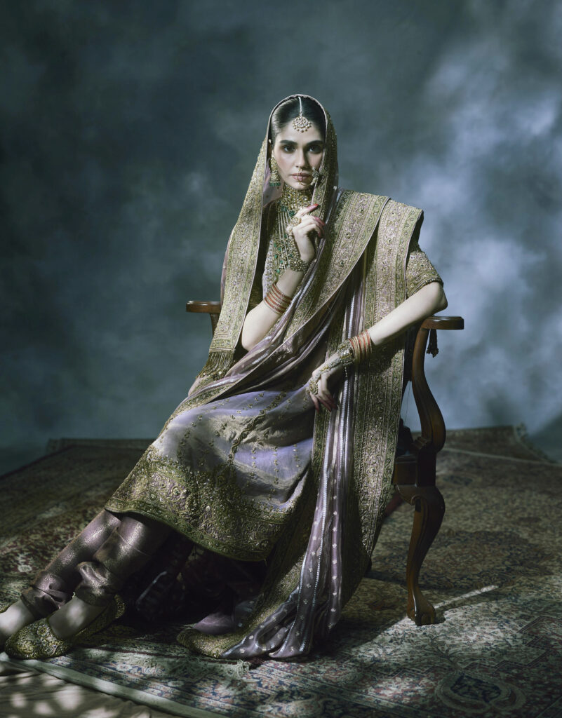 The collection also reintroduces the brand’s legacy techniques — kutki, motichoor, farisha and heirloom weaves — rangkat — all reinterpreted with precision while preserving their intricacy. Every ensemble is meticulously handcrafted using pure copper and options for silver or gold zari, highlighting Divani’s dedication to enduring karigari.