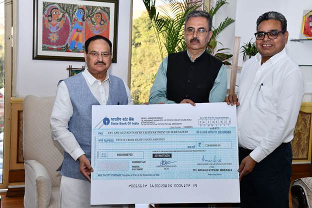 New Delhi, Delhi, 25th of October, 2024 : Brigadier Amar Singh Rathore, Chairman & Managing Director (CMD), FCI Aravali Gypsum & Minerals India Limited (FAGMIL), a Central Government Public Sector Undertaking, under the Ministry of Chemicals & Fertilizers presented a dividend cheque of Rs. 12,84,00,000/-(Rupees Twelve Crore Eight four lakh only) to the Minister of Chemical & Fertilizers and Health & Family Welfare, Shri Jagat Prakash Nadda