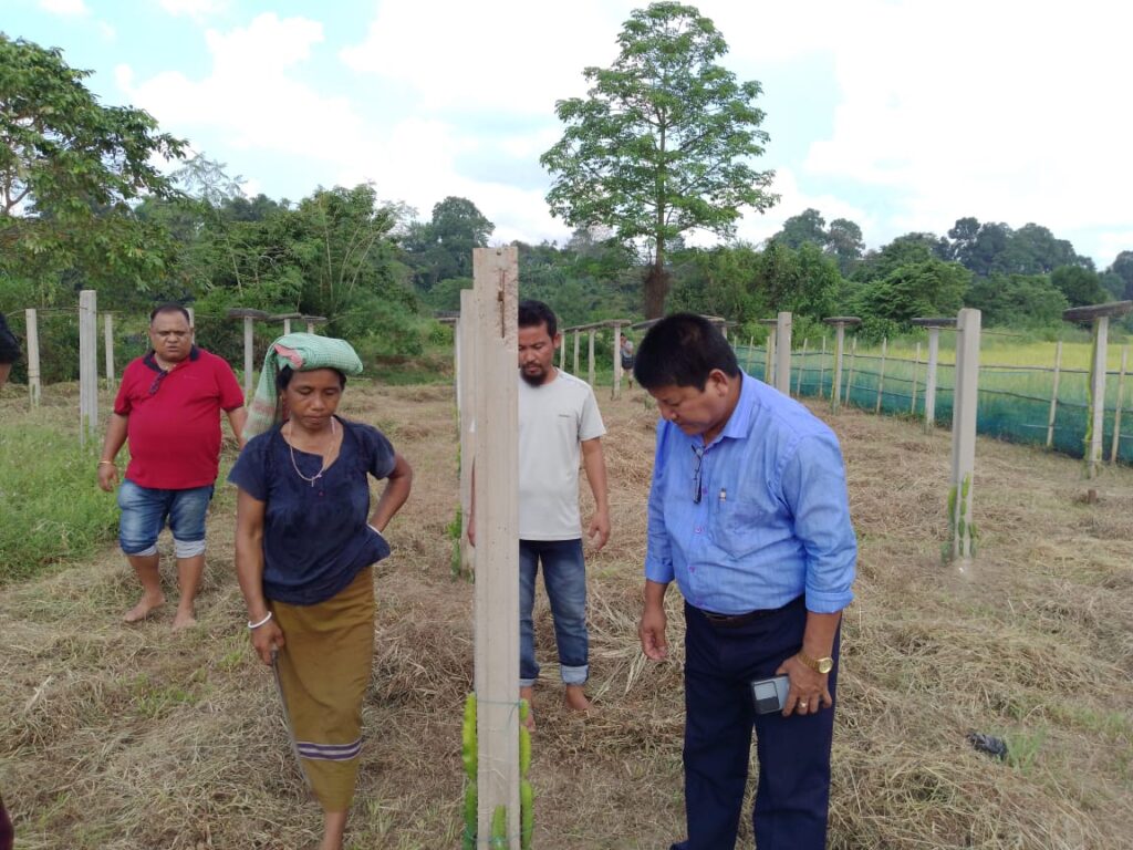 To examine & evaluate the indigenous Reang PTG beneficiaries’ projects district committee chairman has come to Ampi today (7th November, 2022). The DLC chairman of TRP & PTG, Gomati district Rajendra Reang has visited in different departmental projects implemented in various remote Reang areas and interacted with the beneficiaries. Along with programme officer Pradip Acharjee of Ampinagar branch and other some departmental persons as well as DLC member have visited Ekjan Cherra VC where PTG Reang beneficiaries have cultivated dragon fruit in their lands. The DLC chairman Rajendra Reang has exchang­ed views with the Reang beneficiaries of the VC and investigated their dragon cultivation. He has motivated the PTG Reang beneficiaries over this profitable dragon fruit cultivation and advised them to take proper care of this innovative project.