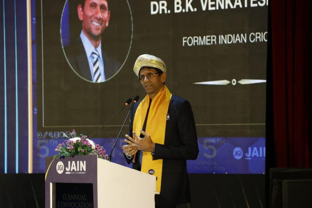 Bengaluru, Karnataka, 20th of November 2025 : Jain (Deemed-to-be University), one of India’s leading private universities, proudly hosted its 15th Annual Convocation, conferring a Doctor Honoris Causa to Dr. B.K. Venkatesh Prasad, Former Indian Cricketer. The event was graced by the presence of distinguished dignitaries including, T.K. Seetharam, Executive Director of Kalyan Jewellers; Dr. Chenraj Roychand,Chancellor, JAIN (Deemed-to-be University);Dr. Jitendra Kumar Mishra, Vice Chancellor (I/c) & Registrar, JAIN (Deemed-to-be University), and Dr. Dinesh Nilkant, Pro Vice Chancellor, JAIN (Deemed-to-be University).