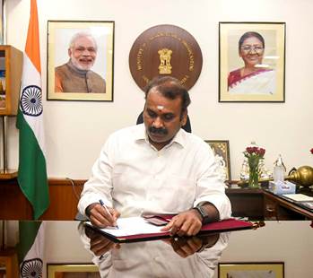 New Delhi, 11th of June, 2024 : Dr L. Murugan today assumed charge as Union Minister of State for Information and Broadcasting. Speaking with media on the occasion Dr Murugan expressed his gratitude to Prime Minister Shri Narendra Modi for reposing his faith in him. He further stated the Ministry of Information and Broadcasting plays a key role in executing Government policies by acting as a communication bridge between the Government and the people of the country.