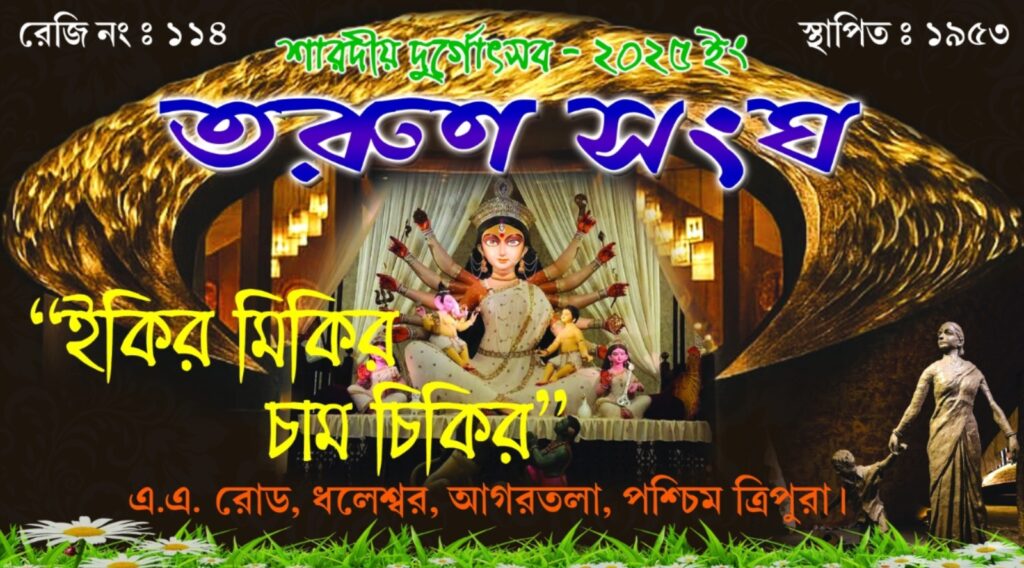 According to report, like the last 14 years, this time too, the Tarun Sangha Club of Dhaleshwar has maintained its tradition and has initiated “Mother Worship” with the mothers and sisters of the area. This year’s Puja Committee (15th year) has been formed with women. The President, Secretary and Treasurer of the newly formed Puja Committee are Gourika Debbarma, Nandita Bhowmik and Moumita Roy Chowdhury respectively. The theme for this year’ Durga Puja 2025 of the of the Tarun Sangha Club is “Ikir Mikir Cham Chikir“. The main objective of this theme is to create awareness against mental and physical abuse of children and to make the youth aware against addiction. Shri Ratan Saha, member of the executive committee of the club, gave this information in a statement.