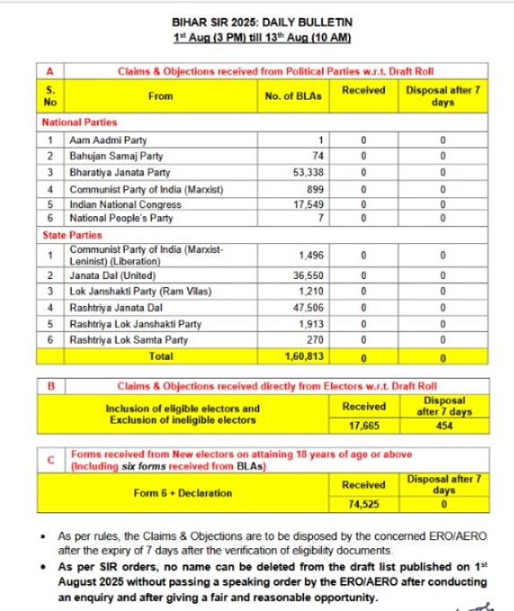 New Delhi, Delhi, 13th of August 2025 : Bihar SIR 2025: Daily Bulletin 1st Aug (3 PM) till 13th Aug (10 am).