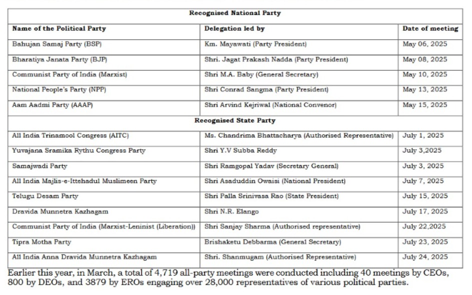 New Delhi, Delhi, 29th of July 2025 : The meeting is in continuation of the interactions being held by ECI with the Presidents of various National and State Political Parties (List annexed). These interactions provide for a long-felt need of constructive discussions which enable National and State Party Presidents to share their suggestions and concerns directly with the Commission. This initiative aligns with the Commission’s broader vision of further strengthening the electoral process in accordance with the existing legal framework with all stakeholders.