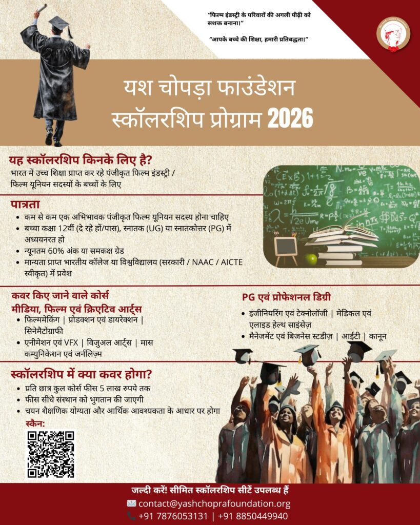 Mumbai, Maharashtra, 10th of April, 2026 : The Yash Chopra Foundation has announced the much-awaited YCF Scholarship Program 2026, a significant initiative aimed at supporting the higher education aspirations of children from Hindi film industry workers. Now in its second year, the program continues to strengthen its commitment to uplifting families who form the backbone of the film ecosystem.