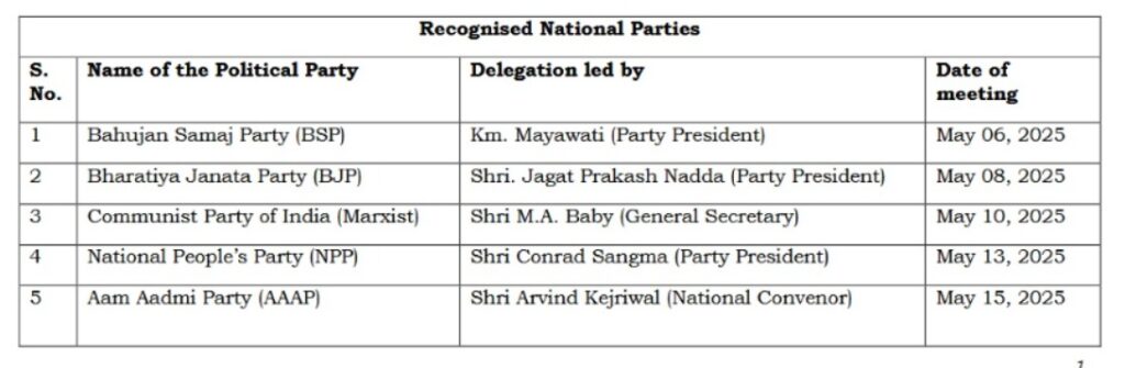 New Delhi, Delhi, 7th of August, 2025 : The meeting is in continuation of the interactions being held by ECI with the Presidents of various National and State Political Parties (List annexed). These interactions provide for a long-felt need of constructive discussions which enable National and State Party Presidents to share their suggestions and concems directly with the Commission. This initiative aligns with the Commission’s broader vision of further strengthening the electoral process in accordance with the existing legal framework with all stakeholders.