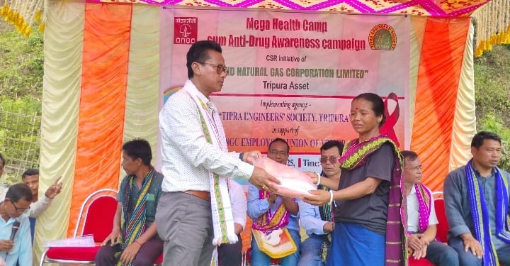 Ampi, Tripura, 5th of September 2025 : With the joint initiative of the TEST (Tipra Engineers’ Society of Tripura) & ONGC a Mega Health Camp cum Anti-Drug Awareness campaign has been conducted here at Debendra Para J.B School in Purba Takka VC under Poangbari Block, South Tripura Thursday (4th September 2025).
