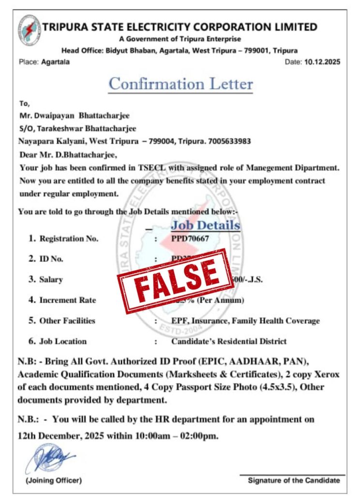 Agartala, Tripura, 17th December 2025: A fresh wave of job fraud has surfaced across Tripura, with organized scam networks targeting unemployed youth by falsely promising government jobs in exchange for money. The latest complaints involve the misuse of the name of Tripura State Electricity Corporation Limited (TSECL), where unsuspecting candidates were allegedly handed fake appointment letters after paying large sums.