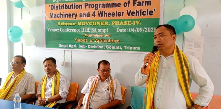 Ampi, Tripura, 5th of September 2025 : With the initiative of Ompi Agri-Sub-Division Distribution Programme Of Farm Machinery & 4 Wheeler has been conducted here in conference hall of SA of Ompi Nagar Gomati Tripura on Thursday (4th September, 2025). On this occasion a large number of local cultivators from different VCs under Ompi Nahar block have gathered here in the agriculture office. In presence of many distinguished dignitaries honourable MLA Pathanlal Jamatia has inaugurated the event