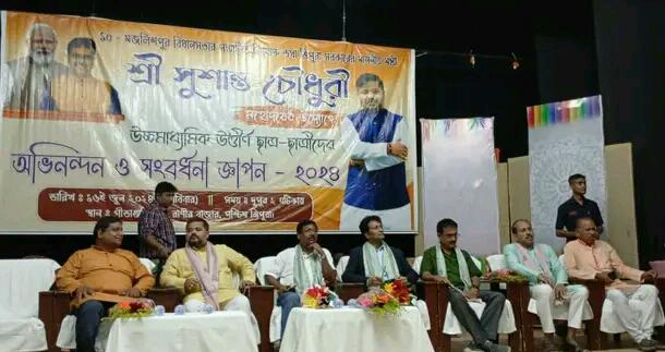 Agartala, 16th of June, 2024 : With the initiative of Food, Civil Supplies & Consumer Affairs, Transport and Tourism minister Sushanta Chowdhury has been organized Felicitation Ceremony of Madhyamik & Higher Secondary Examination 2024 Meritorious Students under 10 Majlishpur Assembly Constituency at Gitanjali Auditorium, Ranirbazar, Agartala on Sunday (16th June, 2024). In the presence of many dignitaries Hon’ble Food, Civil Supplies & Consumer Affairs, Transport and Tourism minister Sushanta Chowdhury inaugurated the programme by lighting the lamp.