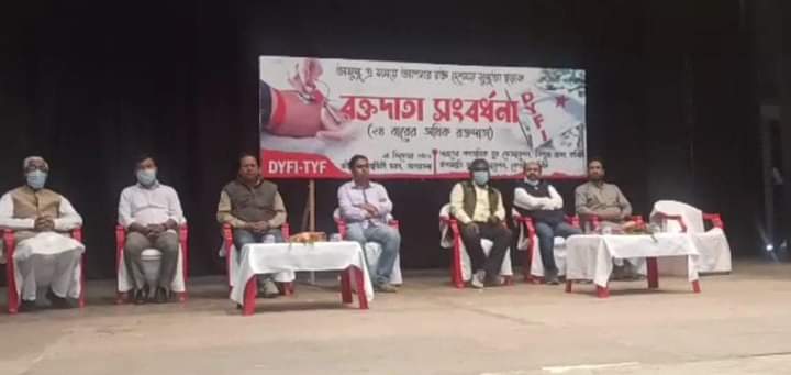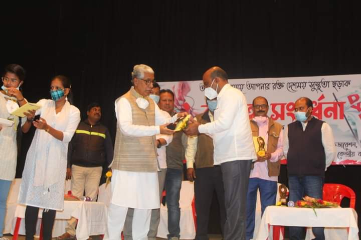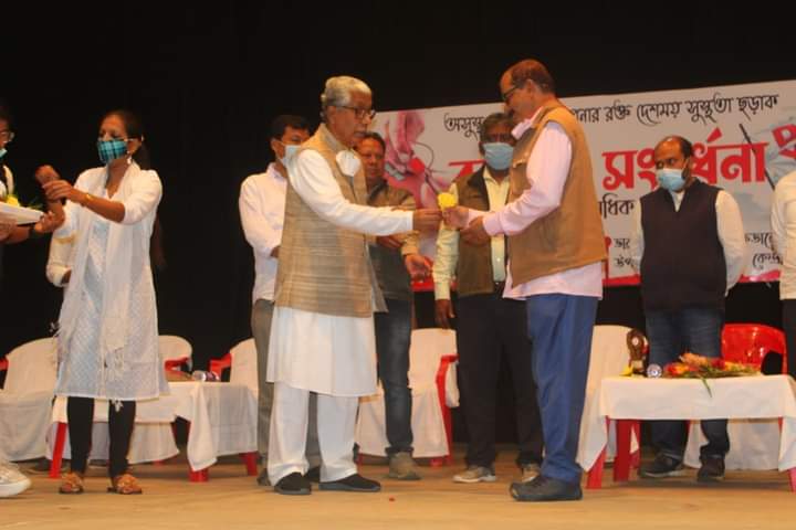 Felicitation Programme of Blood Donors organized by Tripura State Committee of the Democratic Youth Federation of India (DYFI) and Tribal Youth Federation (TYF) on 14th December, 2021 at Rabindra Satabarshiki Bhawan, Agartala. Former State Chief Minister and present opposition leader Manik Sarkar has felicitated those who have donated blood more than 24 times.